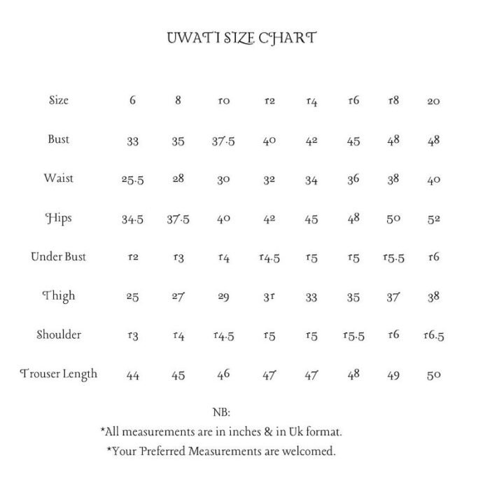 SIZEBUSTWAISTHIPSUNDER BUSTTHIGHSHOULDERTROUSER LENGTH